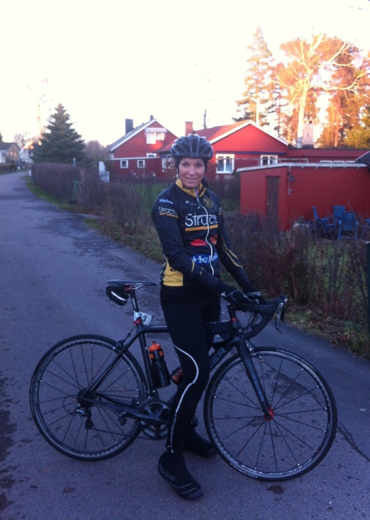 Det va jättekallt trots att det va 5 plusgrader och jag hade varmt underställ och skoöverdrag. Jag fick akta mig för små halkiga isfläckar. Man kan byta däck och cykla landsvägscykel ett tag till men när det är så kallt och mörkt ute så väljer jag att cykla på trainer inne istället.