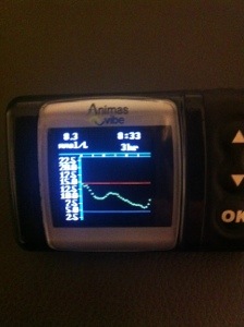 När träningen är klar stiger blodsockret i vanlig ordning och jag återgick till min vanliga basdos, samt tog 2 enheter extra insulin vilket hävde blodsockerstigningen och det låg på perfekta värden efter träningen.