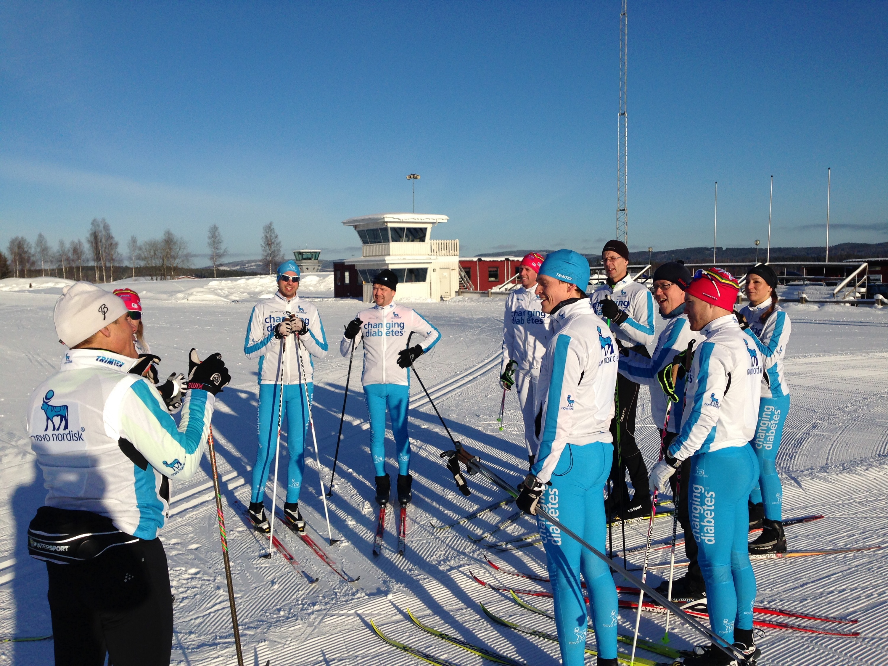 NovoNordisk gänget som åker öppetspår på söndag. Svenskar (Robin Bryntesson vinnare på kortvasan!), danskar (däribland Rikke Deng, den danska mästarinnan på 30km) kanadensare och vårt norska vallarteam 🙂